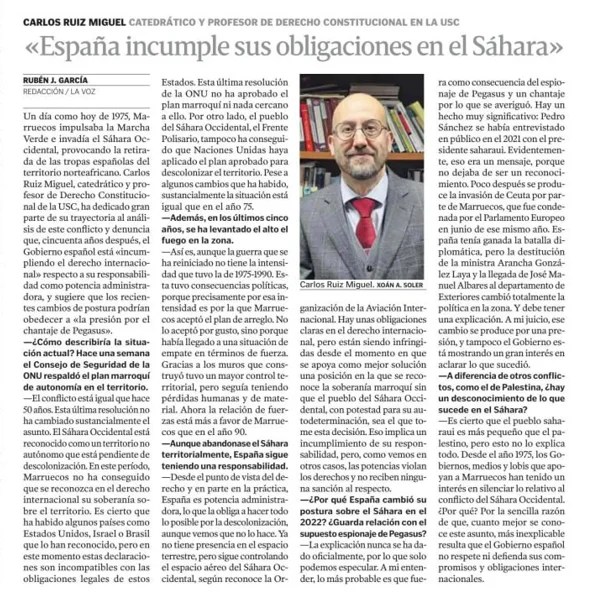 En una entrevista publicada hoy en La Voz de Galicia y realizada por Rubén J. García, el catedrático Carlos Ruiz Miguel vuelve a poner el foco en una realidad jurídica que España y parte de la comunidad internacional prefieren ignorar: el Sáhara Occidental sigue siendo un territorio pendiente de descolonización, y España –por mucho que intente eludirlo– continúa siendo la potencia administradora de iure. Así lo afirma Naciones Unidas desde 1975, sin ambigüedades. No hay transferencia de soberanía a Marruecos, no hay legalidad que legitime su presencia. Cuando el Gobierno español decide reconocer el plan de autonomía marroquí, no está resolviendo el conflicto: está violando el derecho internacional.